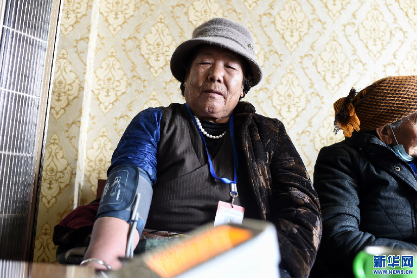 2月24日,白瑪老人在養(yǎng)老驛站測(cè)血壓。新華網(wǎng) 旦增努布 攝