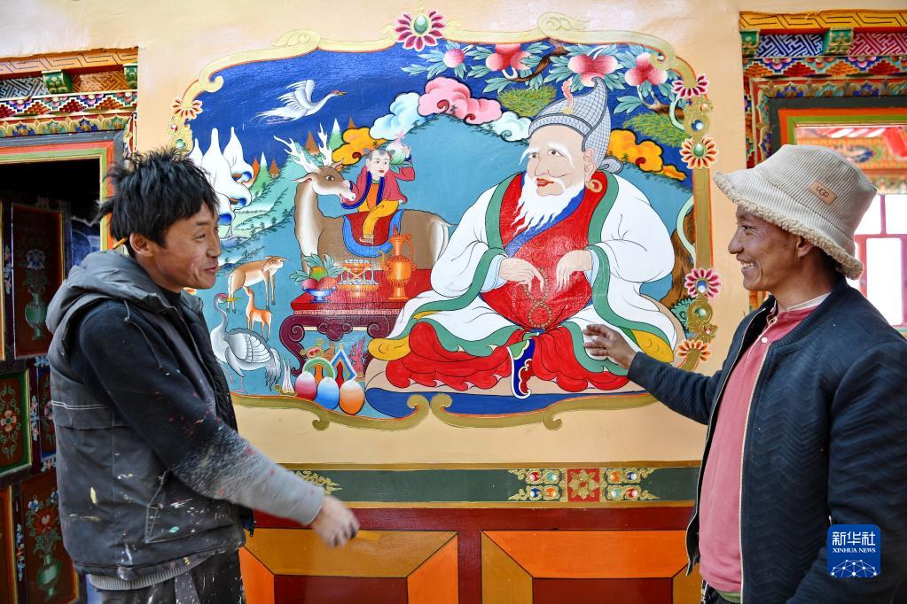 在湘河水庫移民新村,搬遷群眾拉巴旦增(右)與為自家新居繪制壁畫的民間藝人普布次仁交流(3月27日攝)。新華社記者 張汝鋒 攝