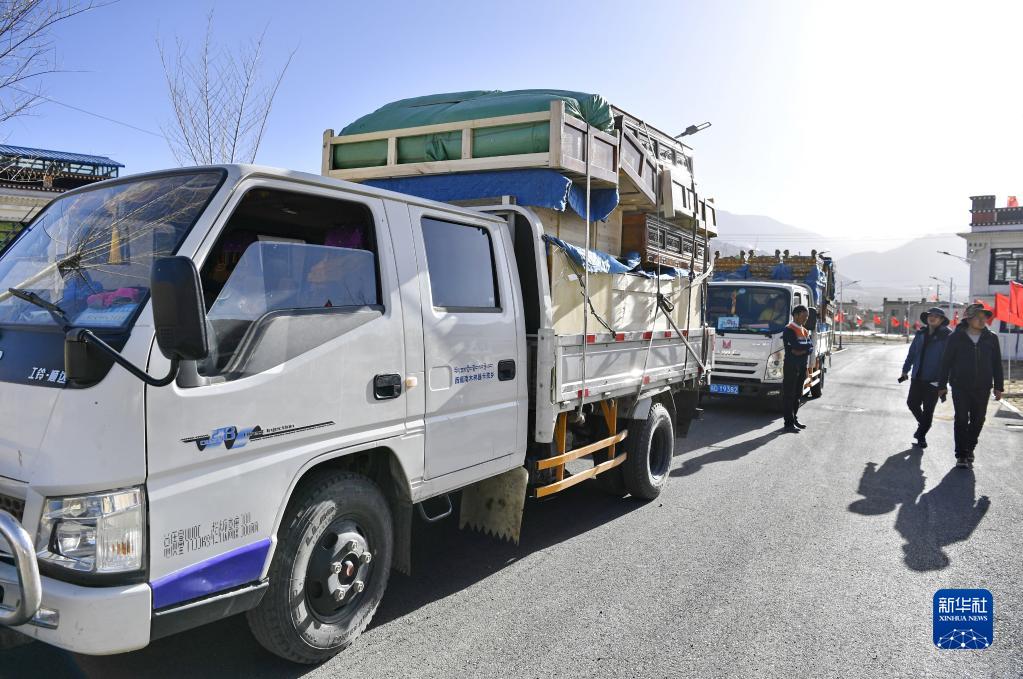 次旺堅參(左)將家具搬進位于湘河水庫移民新村的新家(3月27日攝)。新華社記者 張汝鋒 攝