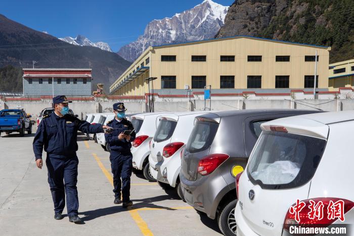 圖為拉薩海關(guān)關(guān)員在吉隆口岸出口貨物查驗(yàn)場(chǎng)監(jiān)管出口國產(chǎn)電動(dòng)車。資料圖 拉薩海關(guān)供圖