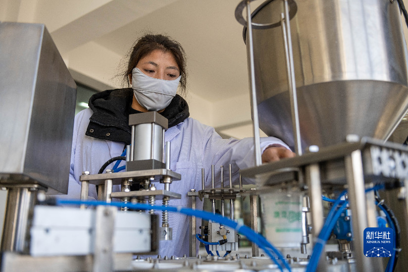 工作人員在西藏娘亞牦牛養(yǎng)殖產(chǎn)業(yè)發(fā)展有限責(zé)任公司的酸奶生產(chǎn)車間作業(yè)(3月30日攝)。新華社記者 周荻瀟 攝