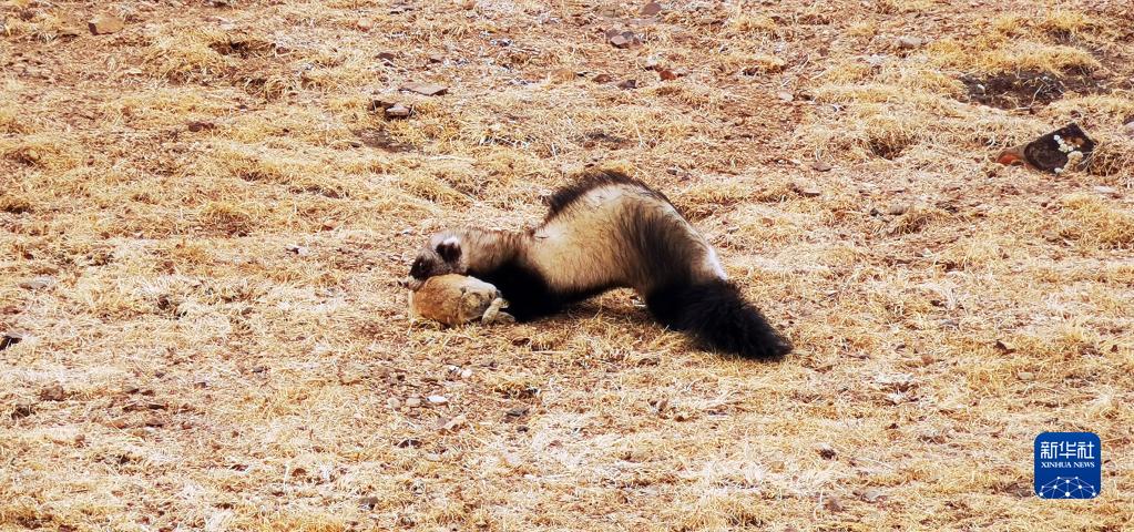 這是西藏那曲班戈縣拍攝的一只艾鼬捕食鼠兔的場景(手機照片,4月13日攝)。新華社記者 沈虹冰 攝