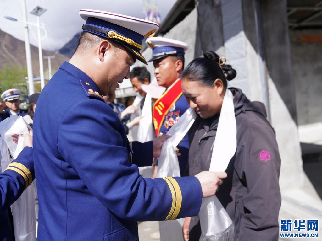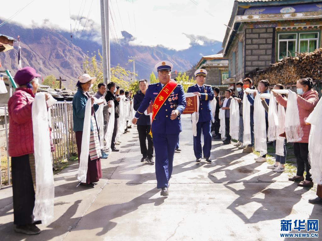 西藏林芝市朗縣洞嘎鎮(zhèn)聶村村民夾道歡迎榮立三等功的消防員洛桑頓珠(4月15日攝)。(李國(guó)燾攝 新華網(wǎng)發(fā))