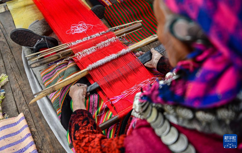 本央在編織制作僜人服飾所需要的布料(4月19日攝)。新華社記者 晉美多吉 攝