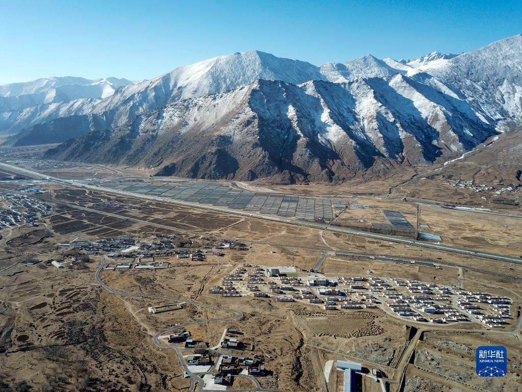 這是拉薩市堆龍德慶區(qū)古榮鎮(zhèn)榮瑪高海拔生態(tài)搬遷點(diǎn)的全景,高速公路、國道、鄉(xiāng)村道路使搬遷點(diǎn)與外面的世界連接通暢(無人機(jī)照片,2月28日攝)。新華社記者 姜帆 攝