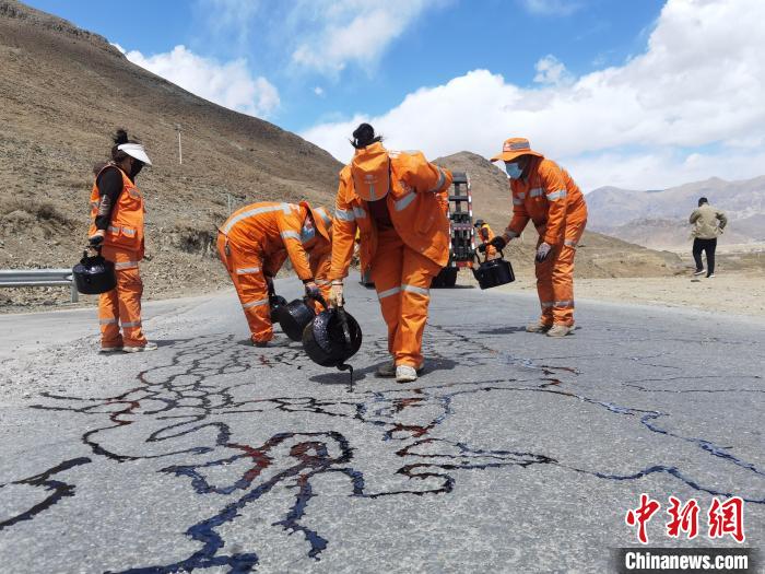 圖為在基層農(nóng)村公路,女護(hù)路員正熟練地開(kāi)展瀝青灌縫作業(yè)。西藏自治區(qū)交通運(yùn)輸廳供圖