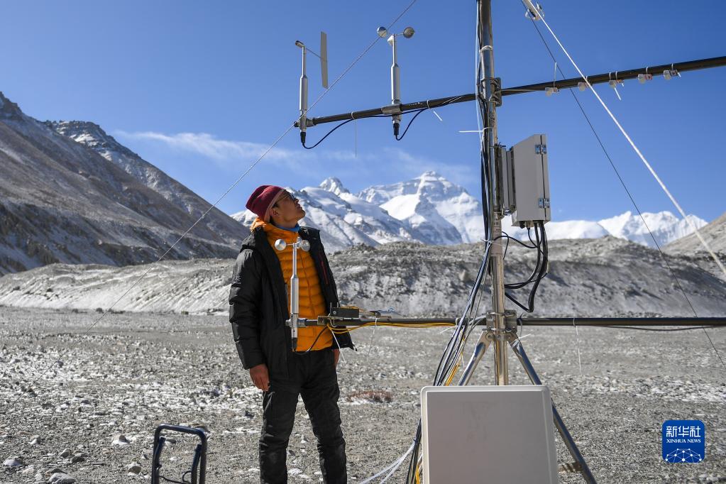 5月3日,在珠峰登山大本營(yíng),科研人員檢查微波輻射計(jì)。新華社記者 姜帆 攝