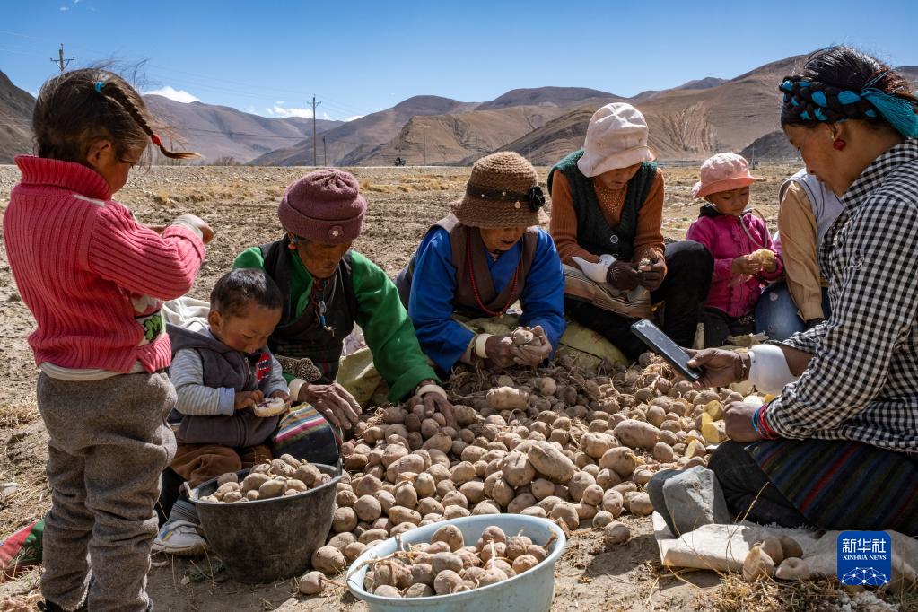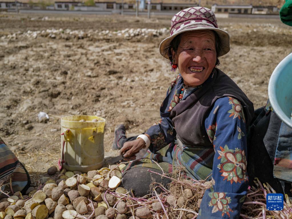 西藏定日縣扎西宗鄉(xiāng)日白拉新村的村民在切發(fā)芽的土豆(5月10日攝)。新華社記者 孫非 攝