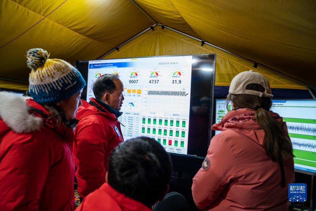 中科院院士、第二次青藏高原綜合科學(xué)考察研究隊(duì)隊(duì)長姚檀棟(左二)查看觀測(cè)儀器數(shù)據(jù)(5月15日 攝)。新華社記者 孫非 攝