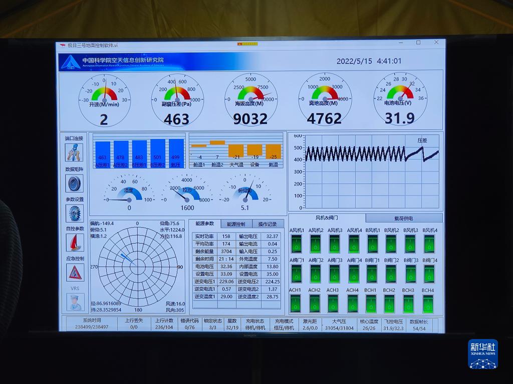 中國科學(xué)院空天信息創(chuàng)新研究院“極目一號(hào)”Ⅲ型浮空艇地面控制軟件顯示,浮空艇達(dá)到海拔9032米(5月15日 攝)。新華社記者 田金文 攝