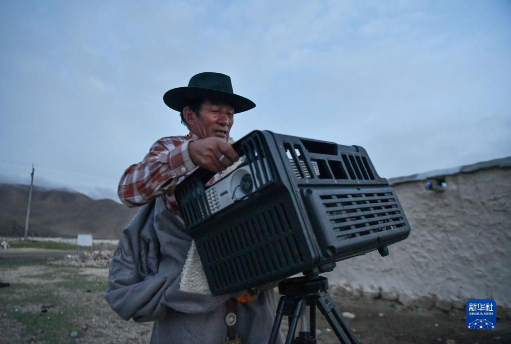 在西藏當(dāng)雄縣拉多村,羅珠在準(zhǔn)備放映電影所需的器材(5月20日攝)。新華社記者 孫非 攝