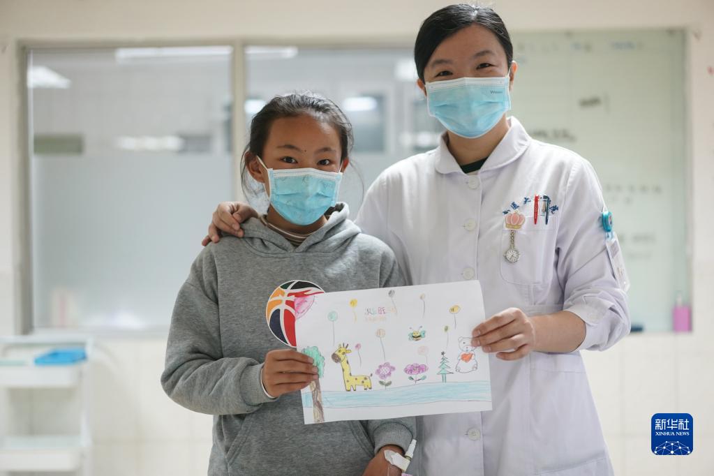 小患者次仁旺姆將自己的畫送給護士湯燕,祝她護士節(jié)快樂(5月12日攝)。