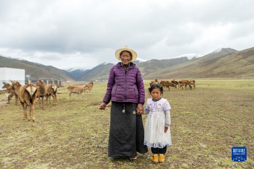 向秋拉姆和孫女在類烏齊馬鹿國家級自然保護(hù)區(qū)內(nèi)合影(5月21日攝)。新華社記者 周荻瀟 攝