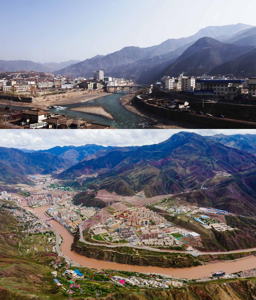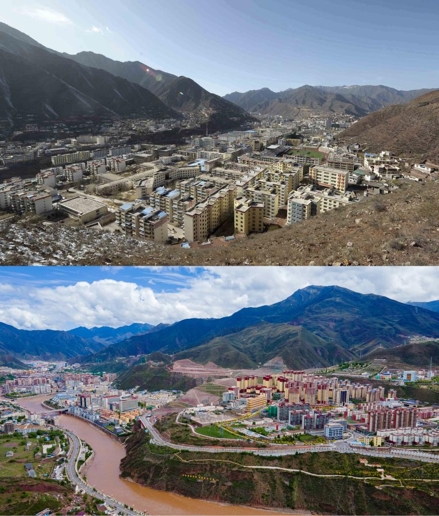 拼版照片:上圖是2009年3月13日拍攝的昌都(新華社記者 普布扎西 攝);下圖是2022年5月22日拍攝的昌都市卡若區(qū)(新華社記者 周荻瀟 攝,無人機照片)。新華社發(fā)