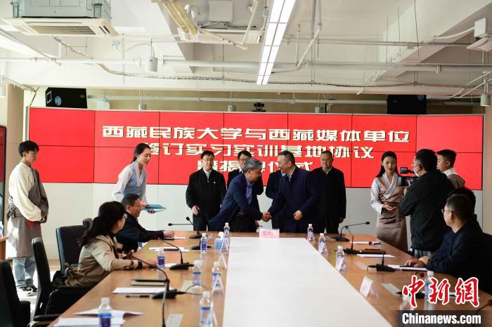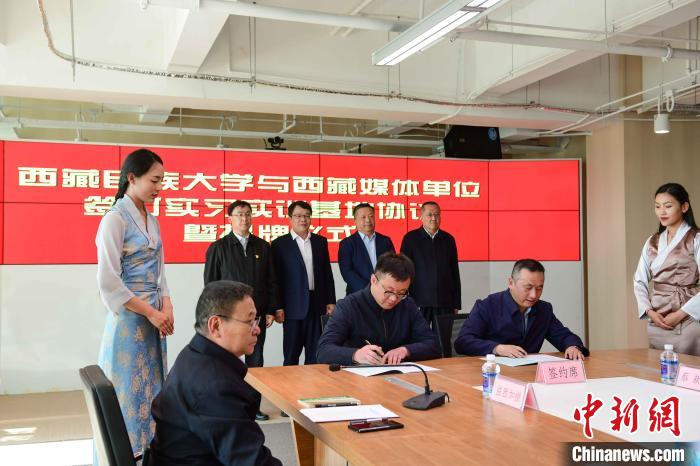 5月27日,西藏民族大學與西藏日報社、西藏廣播電視臺、人民網(wǎng)西藏頻道、中國新聞社西藏分社、中國西藏網(wǎng)西藏記者站等媒體單位簽訂實習實訓(xùn)基地協(xié)議暨揭牌儀式在西藏日報舉行。