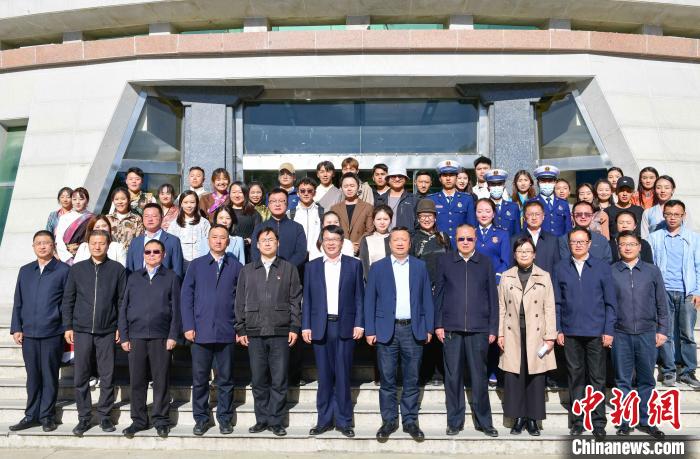 圖為簽約儀式上媒體單位負責人跟西藏民族大學的實習生合影。 貢嘎來松 攝