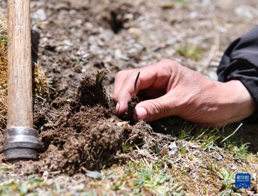 蟲草出土瞬間(5月25日攝)。新華社記者 晉美多吉 攝