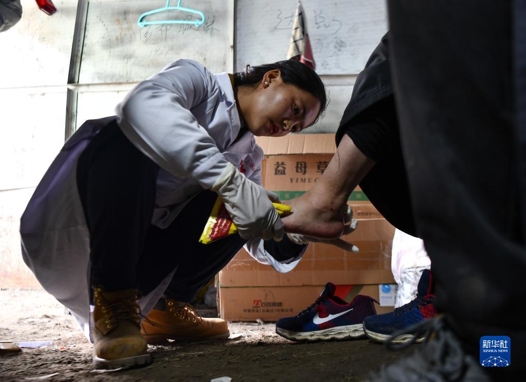 西藏那曲市比如縣良曲鄉(xiāng)然木塘村蟲草采集點(diǎn)的營地里,政府為采集點(diǎn)配備的醫(yī)護(hù)人員在給采集蟲草時(shí)受傷的牧民治療(5月26日攝)。新華社記者 晉美多吉 攝
