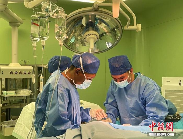 圖為5月7日,次仁云丹(左)在拉薩為患者進行手術(shù)治療。 中新社記者 冉文娟 攝