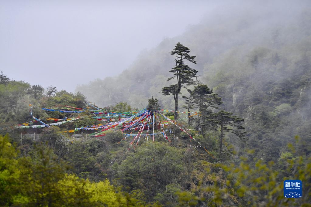 玉麥鄉(xiāng)境內(nèi)云霧繚繞中的原始森林一景(5月31日攝)。新華社記者 張汝鋒 攝