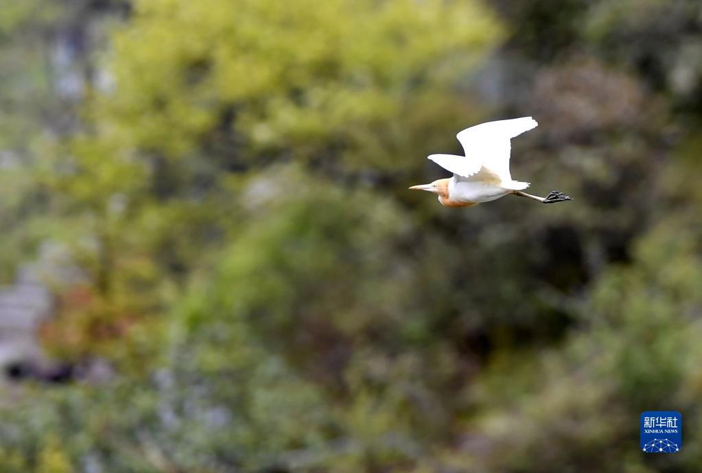 牛背鷺在玉麥鄉(xiāng)境內(nèi)原始森林邊盤旋(5月31日攝)。新華社記者 張汝鋒 攝