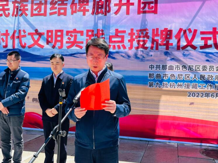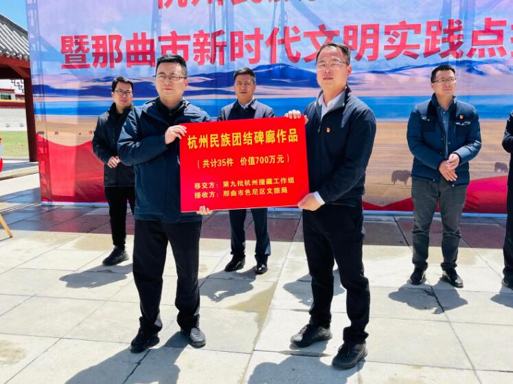 儀式上,那曲市委宣傳部決定將杭州民族團結碑廊設為那曲市新時代文明實踐點,并進行授牌。杭州援藏工作組向色尼區(qū)捐贈價值700萬元的杭州民族團結碑廊書法作品。