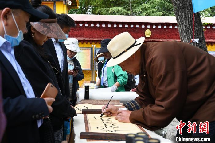 圖為活動(dòng)現(xiàn)場(chǎng),藏文書法展示?!≮w朗 攝