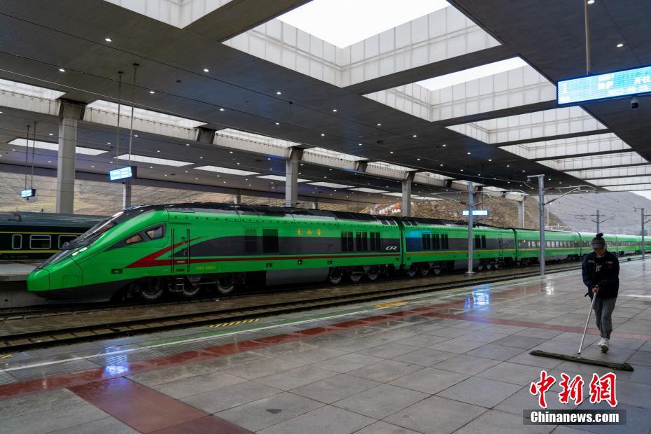6月25日,西藏第一條電氣化鐵路——拉林鐵路開通運(yùn)營滿一周年。一年來,累計(jì)運(yùn)送旅客113.7萬人次、貨物4.78萬噸。圖為當(dāng)日,拉薩火車站內(nèi),復(fù)興號(hào)整裝待發(fā)。 中新社記者 江飛波 攝