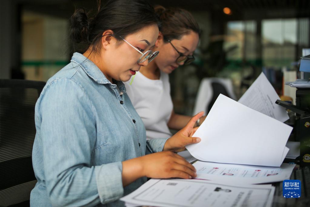 “格桑花開”大學(xué)生就業(yè)創(chuàng)業(yè)特訓(xùn)營學(xué)員、西藏藏建科技股份有限公司職員次仁瓊達(dá)(左)在工作(2022年6月24日攝)。新華社記者 姜帆 攝