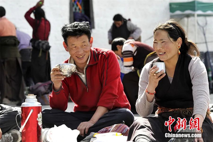 2012年3月,西藏拉薩,民眾在大昭寺廣場上邊喝酥油茶邊聊天。中新社記者 李林 攝