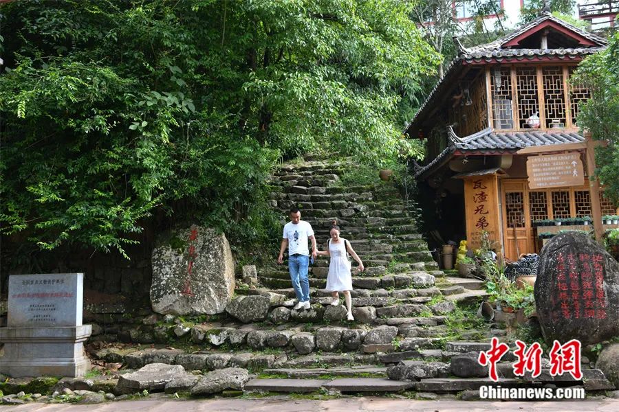 2022年6月,云南省普洱市寧洱縣那柯里村,游客走在茶馬古道遺址上體驗。中新社記者 劉冉陽 攝