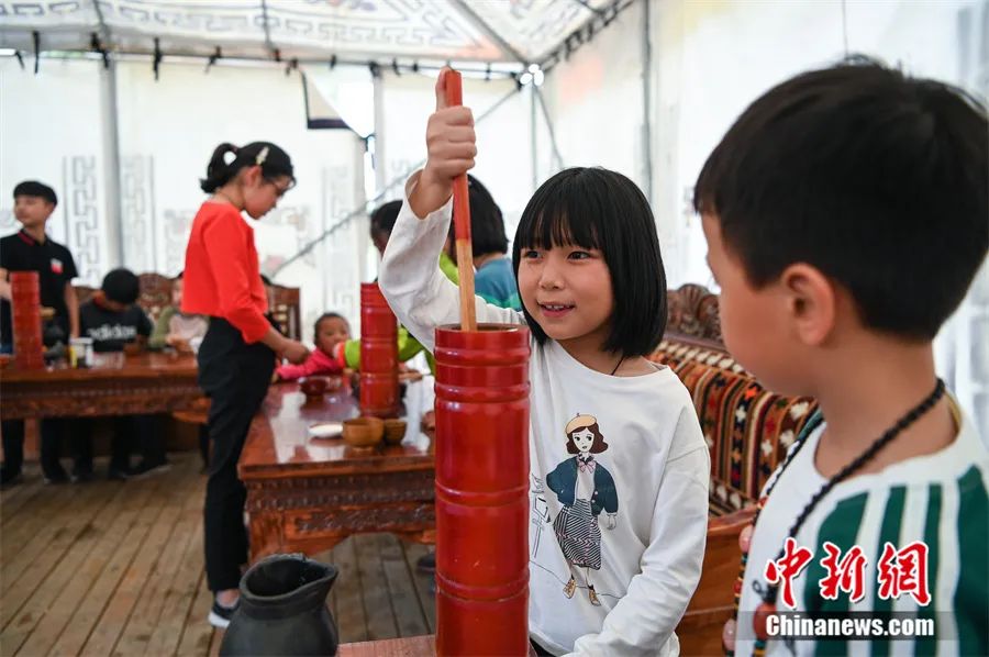 2019年7月,來自江蘇蘇州的小游客們在拉薩體驗酥油茶制作。中新社記者 何蓬磊 攝