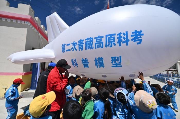 “快看,這個大白鯨飛起來啦!”,海拔4119米的西藏定日縣扎西宗鄉(xiāng)完全小學附屬幼兒園里,小朋友們看到緩緩起飛的浮空艇模型興奮地喊著。7月13日上午,中科院珠峰站觀測主管席振華用浮空艇模型、科學小實驗,在這所“珠峰之鄉(xiāng)”幼兒園的新操場上為孩子們上了一堂生動有趣的戶外科普課。
