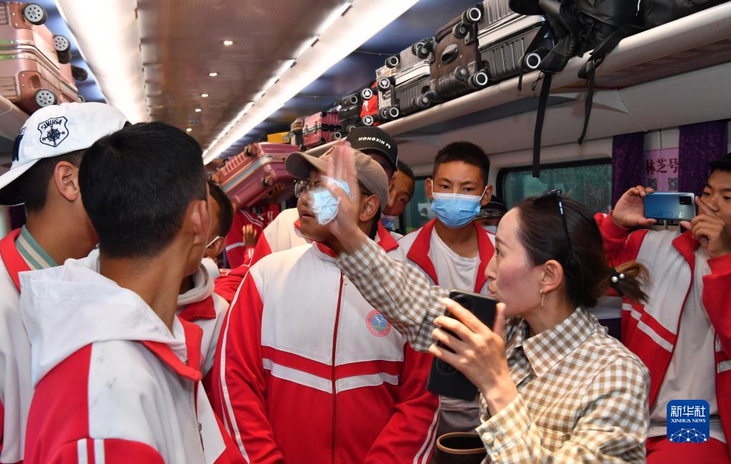 7月17日,拉薩那曲第三高級中學高一(15)班班主任次仁曲珍(右二)在車廂里向?qū)W生們囑咐注意事項。新華社記者 覺果 攝