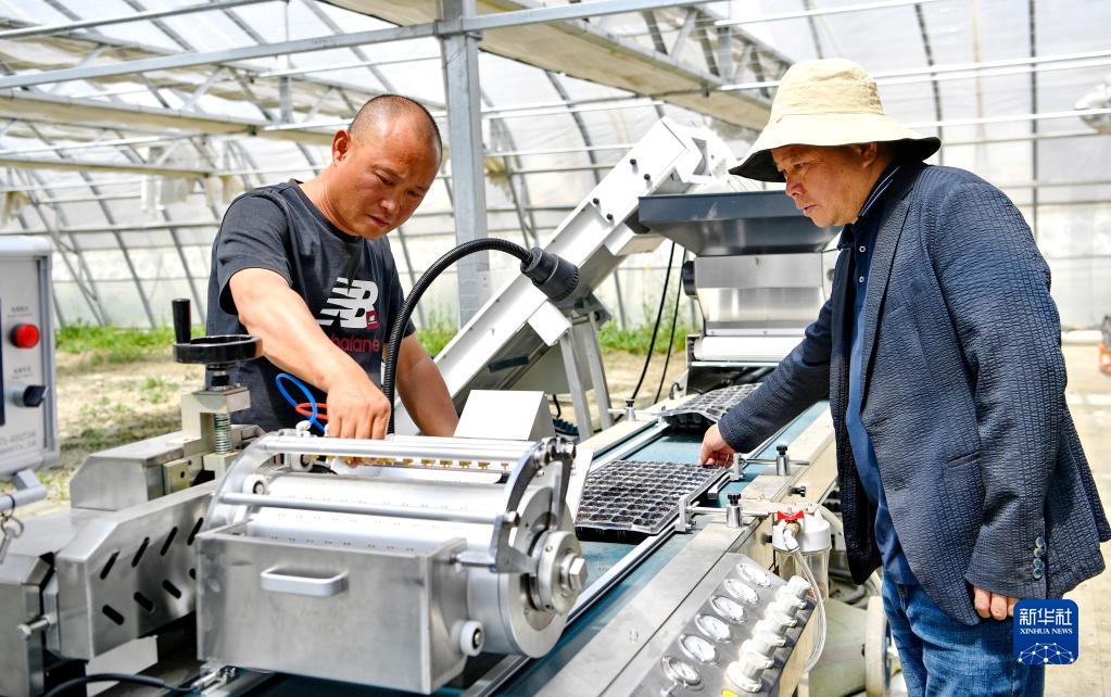 7月11日,在瓊結(jié)縣千畝蔬菜基地育苗大棚內(nèi),基地負(fù)責(zé)人管大鵬(右)和技術(shù)人員正在調(diào)試播種流水線。新華社記者 張汝鋒 攝