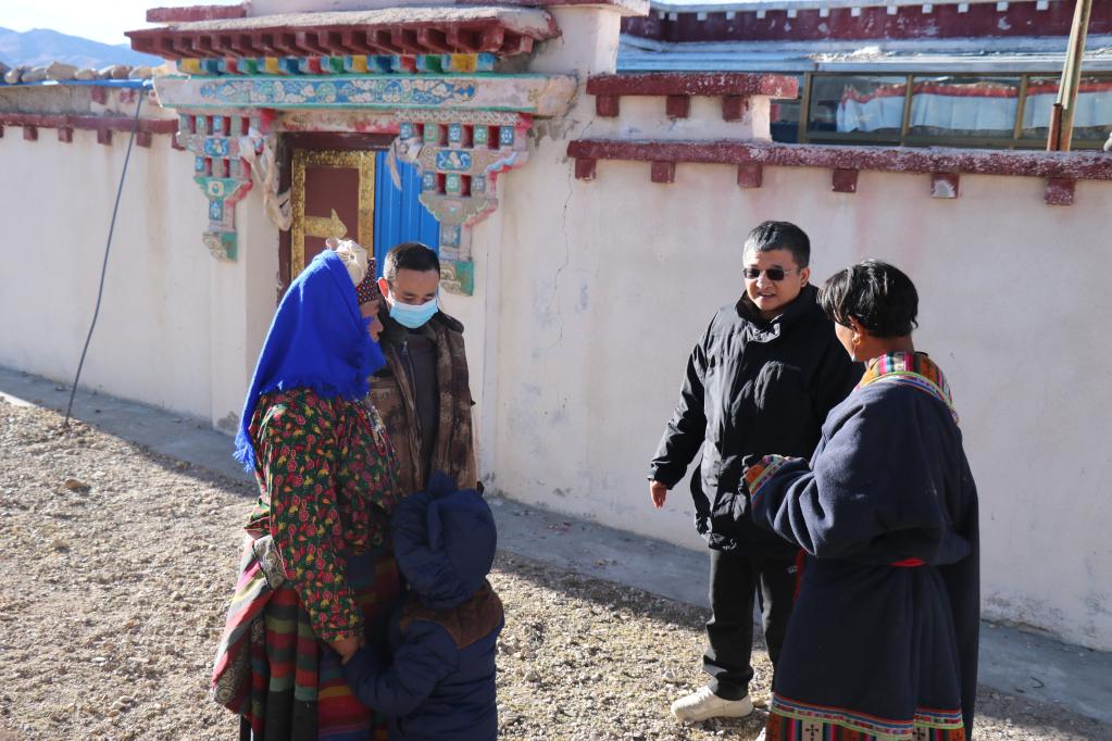 王軍強(qiáng)(右二)在申扎縣巴扎鄉(xiāng)結(jié)對(duì)幫扶戶達(dá)吉家中了解生活情況。(圖片由申扎縣委宣傳部提供)