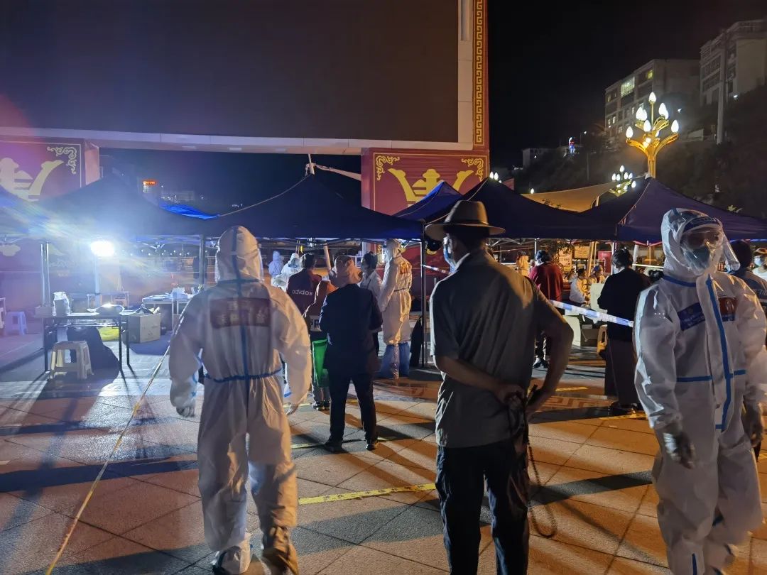 “為了您的安全,請保持1米以上間隔,謝謝?!蓖砩?點多,在茶馬廣場,支隊三級消防士張興梁,依然堅守在抗疫一線,維持著排隊做核酸的長隊。從早上7點開始,張興梁和其他消防隊員已堅守了14個多小時?!拔鞑貢円箿夭钐卮?,白天防護服里面衣服都濕透了,但是到晚上這個點已經(jīng)干了,正好不用換衣服了?!睆埮d梁打趣的說到。