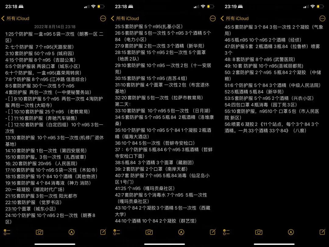 8月14日的凌晨,疲憊不堪的貢秋丁達(dá)和西繞拉翁正準(zhǔn)備在車(chē)?yán)镄菹?,這時(shí)電話鈴聲響了,“你好,是貢秋丁達(dá)嗎?剛才接到通知,嘠瑪貢桑街道北社區(qū)需要運(yùn)輸防護(hù)服10套,N95口罩10個(gè)?!薄笆盏剑 必暻锒∵_(dá)回復(fù)道。強(qiáng)忍著身體的疲憊,貢秋丁達(dá)和西繞拉翁重新打起了精神,向著目的地再次進(jìn)發(fā)。