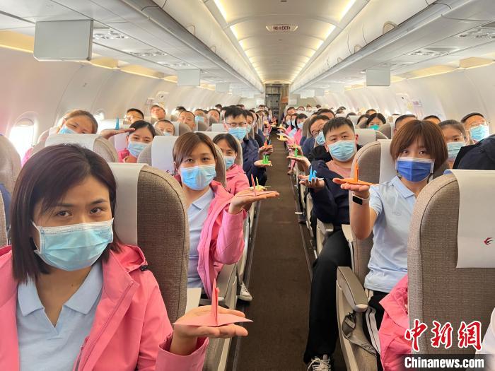 東航機(jī)組制作了寓意“美好、希望、祝?!钡那Ъ堹Q送給援藏醫(yī)護(hù)隊(duì)員,希望醫(yī)護(hù)隊(duì)員們平平安安歸來,祝福自治區(qū)各族同胞早日戰(zhàn)勝疫情。
