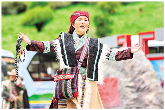 5月31日,演員在隆子縣玉麥鄉(xiāng)文化廣場(chǎng)表演歌舞劇《天邊格桑花》。 新華社記者張汝鋒攝
