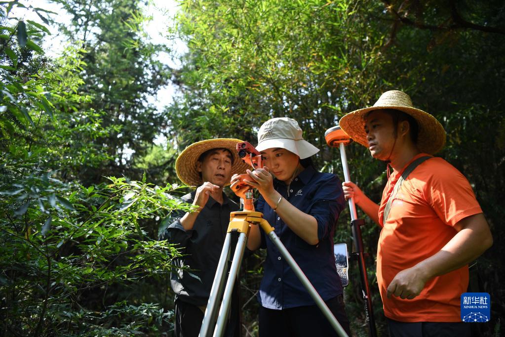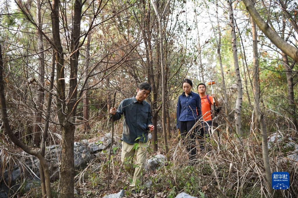 9月21日,在廣東韶關(guān)樂(lè)昌市秀水鎮(zhèn)大羅嶺村,白拉曲珍(中)和師傅江建發(fā)(前)、同事伍國(guó)清在石漠化生態(tài)恢復(fù)監(jiān)測(cè)平臺(tái)固定樣地工作。新華社記者 鄧華 攝