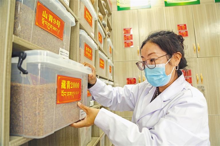 瓊結(jié)縣農(nóng)業(yè)農(nóng)村局高級(jí)農(nóng)藝師尼瑪卓嘎在查驗(yàn)藏青2000種子。記者 次旺 通訊員 倫珠澤仁 攝
