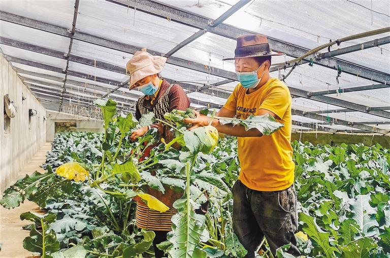 在山南市隆子縣菜籃子基地的大棚內(nèi),記者看到,農(nóng)民們正忙碌地采摘成熟的花椰菜、青椒、西藍(lán)花等蔬菜。