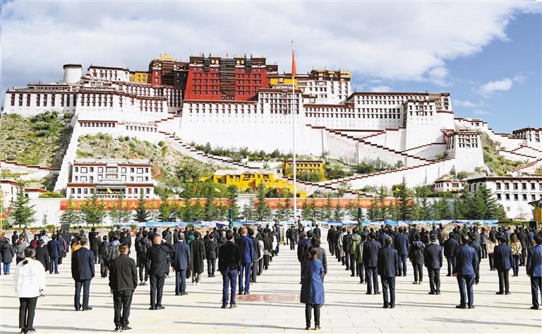 10月1日上午,西藏自治區(qū)慶祝中華人民共和國(guó)成立73周年“升國(guó)旗、唱國(guó)歌”儀式在拉薩布達(dá)拉宮廣場(chǎng)舉行。圖為儀式現(xiàn)場(chǎng)。記者 李洲 攝