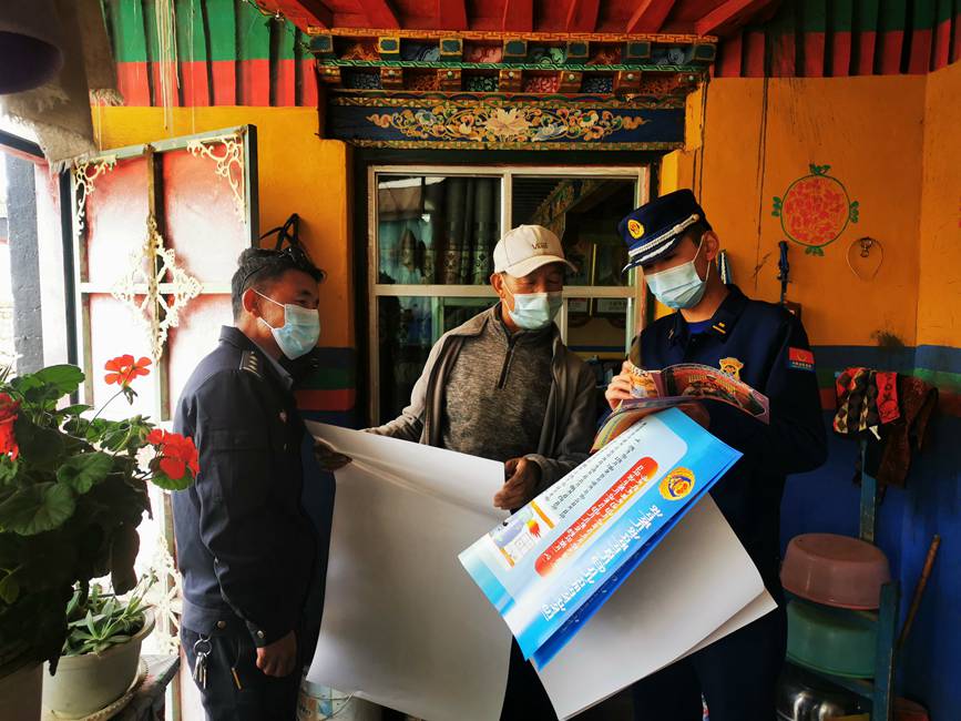 圖為日喀則市消防救援支隊聯(lián)合轄區(qū)民警進村入戶宣傳。