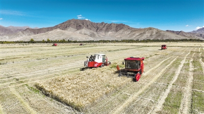 西藏日喀則市江孜縣熱索鄉(xiāng)努康村農(nóng)機合作社的村民集中對村里三千多畝耕地進(jìn)行機械化收割新華社記者 晉美多吉攝