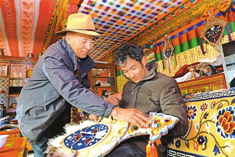 圖為拉薩市非物質(zhì)文化遺產(chǎn)傳承人、墨竹工卡縣達普林耐傳統(tǒng)服飾制作技藝第五代傳承人加措(左)向徒弟教授面具制作技藝。記者 潘多 攝