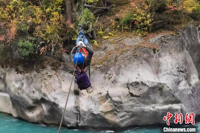 看到具美丹增安全抵達(dá)對(duì)岸后,陳來尼瑪拿出一條事先準(zhǔn)備好的尼龍繩,系在了朗尼的安全帶上。