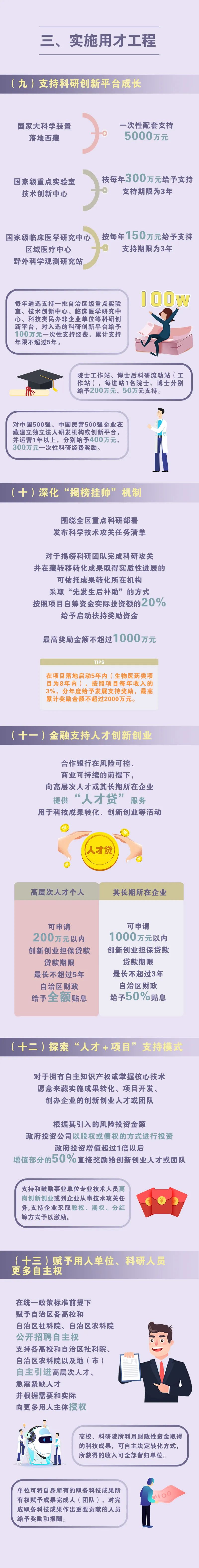 支持科研創(chuàng)新平臺成長,對重點(diǎn)實(shí)驗(yàn)室、技術(shù)創(chuàng)新中心以及院士工作站、博士后科研流動站(工作站)等給予經(jīng)費(fèi)支持。深化“揭榜掛帥”機(jī)制,對完成科研攻關(guān)并在藏轉(zhuǎn)化成果取得實(shí)質(zhì)性進(jìn)展的,給予啟動扶持獎勵資金、發(fā)展支持獎勵資金。向高層次人才或其長期所在企業(yè)提供“人才貸”服務(wù),自治區(qū)財政予以貼息。鼓勵創(chuàng)新創(chuàng)業(yè)人才或團(tuán)隊(duì)來藏實(shí)施成果轉(zhuǎn)化、項(xiàng)目開發(fā)、創(chuàng)辦企業(yè),政府投資公司參與創(chuàng)新創(chuàng)業(yè)項(xiàng)目,政府投資增值的部分收益可直接用于獎勵。在統(tǒng)一政策標(biāo)準(zhǔn)、嚴(yán)格執(zhí)行規(guī)定前提下,賦予用人單位、科研人員更多自主權(quán)。