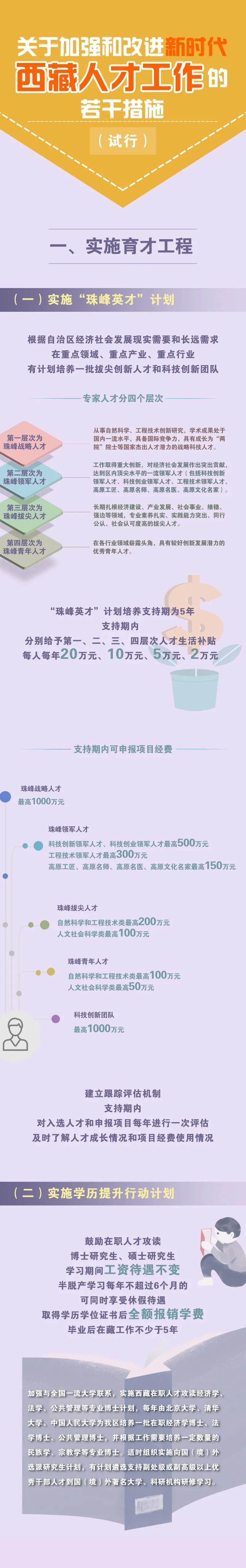 實(shí)施“珠峰英才”計劃,每年遴選支持一批珠峰戰(zhàn)略人才、珠峰領(lǐng)軍人才、珠峰拔尖人才、珠峰青年人才和科技創(chuàng)新團(tuán)隊(duì),在5年支持期內(nèi)給予生活補(bǔ)貼和項(xiàng)目經(jīng)費(fèi)支持,項(xiàng)目經(jīng)費(fèi)最高可申請1000萬元。實(shí)施學(xué)歷提升行動,支持在職人才攻讀研究生,并協(xié)調(diào)全國頂尖高校為西藏定向培養(yǎng)博士研究生。